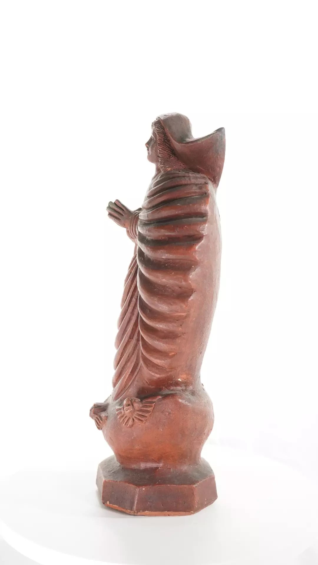 Escultura devocional em cerâmica representando Nossa Senhora em atitude orante, com mãos postas e composição vertical marcada por panejamentos amplos e ritmados, que conferem movimento e equilíbrio à peça. A modelagem revela forte caráter artesanal, com tratamento expressivo do rosto e do manto, resultando em presença simbólica serena e acolhedora.
